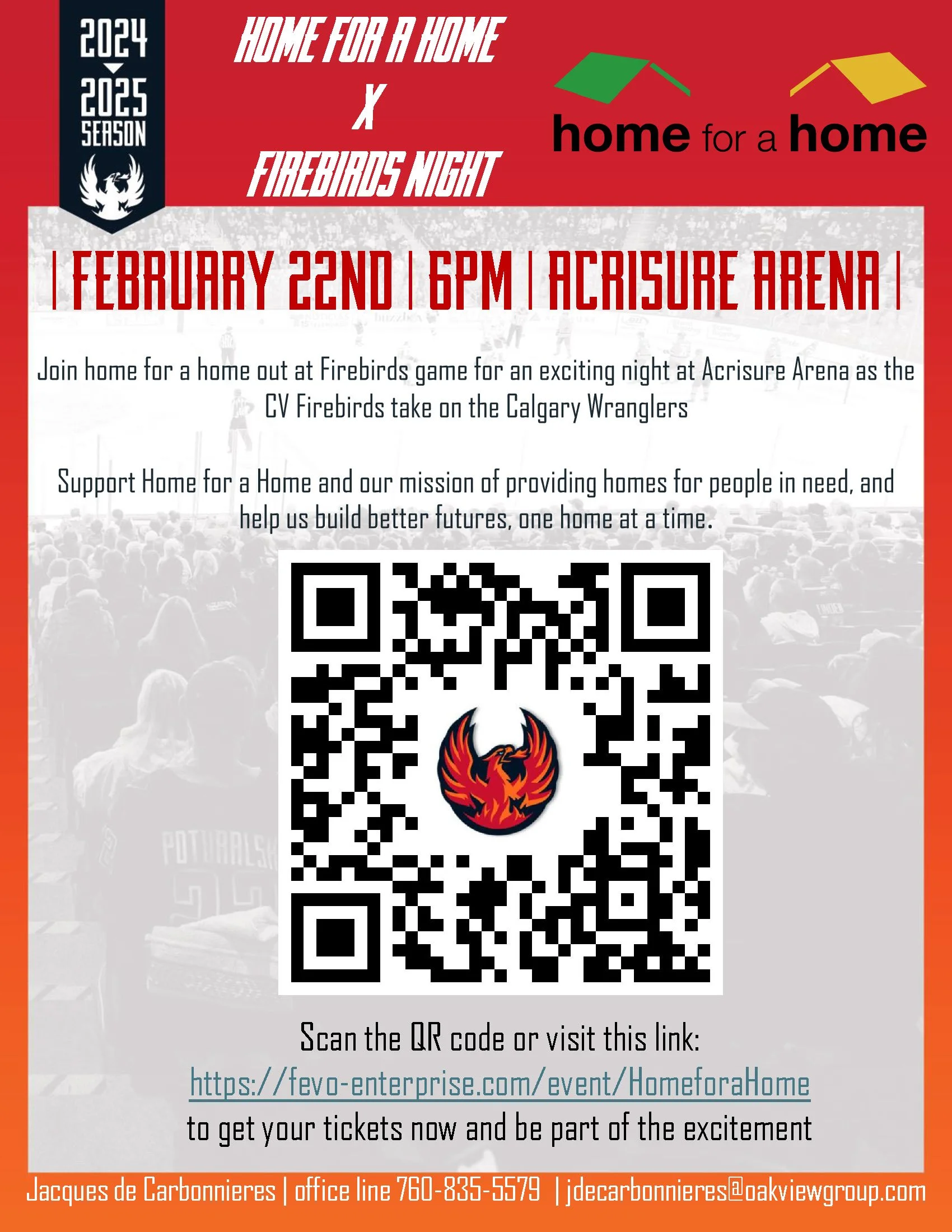 Join Home for a Home at the Firebirds game for an exciting night at Acrisure Arena as the CV Firebirds take on the Calgary Wranglers.